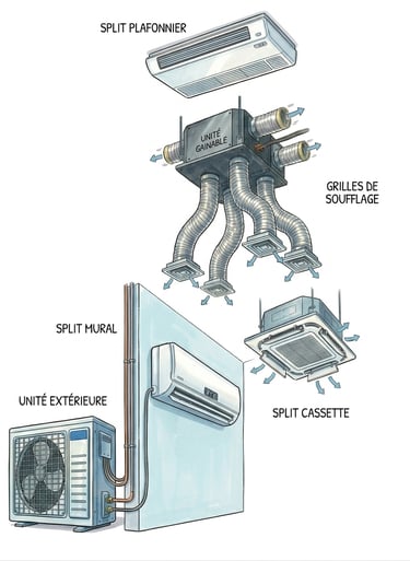Les différents types d'appareils de climatisation et de chauffage que je vous propose.