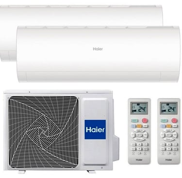 Détails du produit : Le dual split Haier Pearl combine une unité extérieure 2U40S2SM1FA et deux unités intérieures murales : une AS25PBAHRA de 9000 BTU et une AS35PBAHRA de 12000 BTU. Cette configuration permet de refroidir ou de chauffer deux espaces de tailles variées en même temps, tout en garantissant une consommation d'énergie optimisée et un confort maximum. Grâce à la technologie Inverter, la puissance est ajustée en temps réel pour maintenir une température stable, diminuer la consommation d'énergie et prolonger la durée de vie de l'appareil. Ce modèle réversible assure une performance optimale en été comme en hiver.